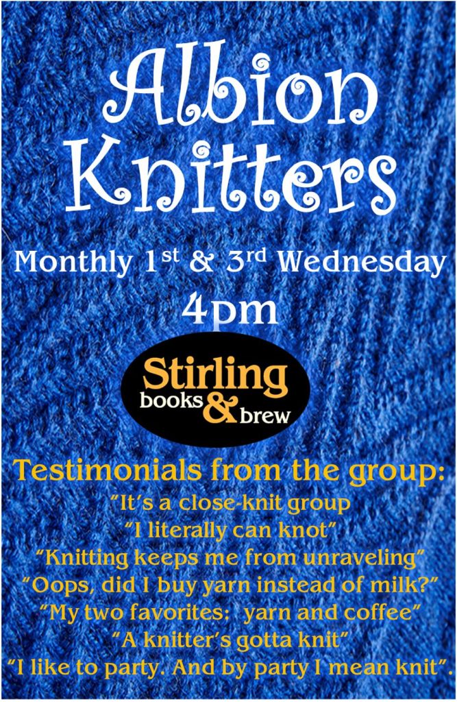 Join the knitters at Stirling Books & Brew monthly from 4-5:30pm on the first and the third Wednesday of the month. For more information, contact Beth Lincoln at blincoln@albion.edu.