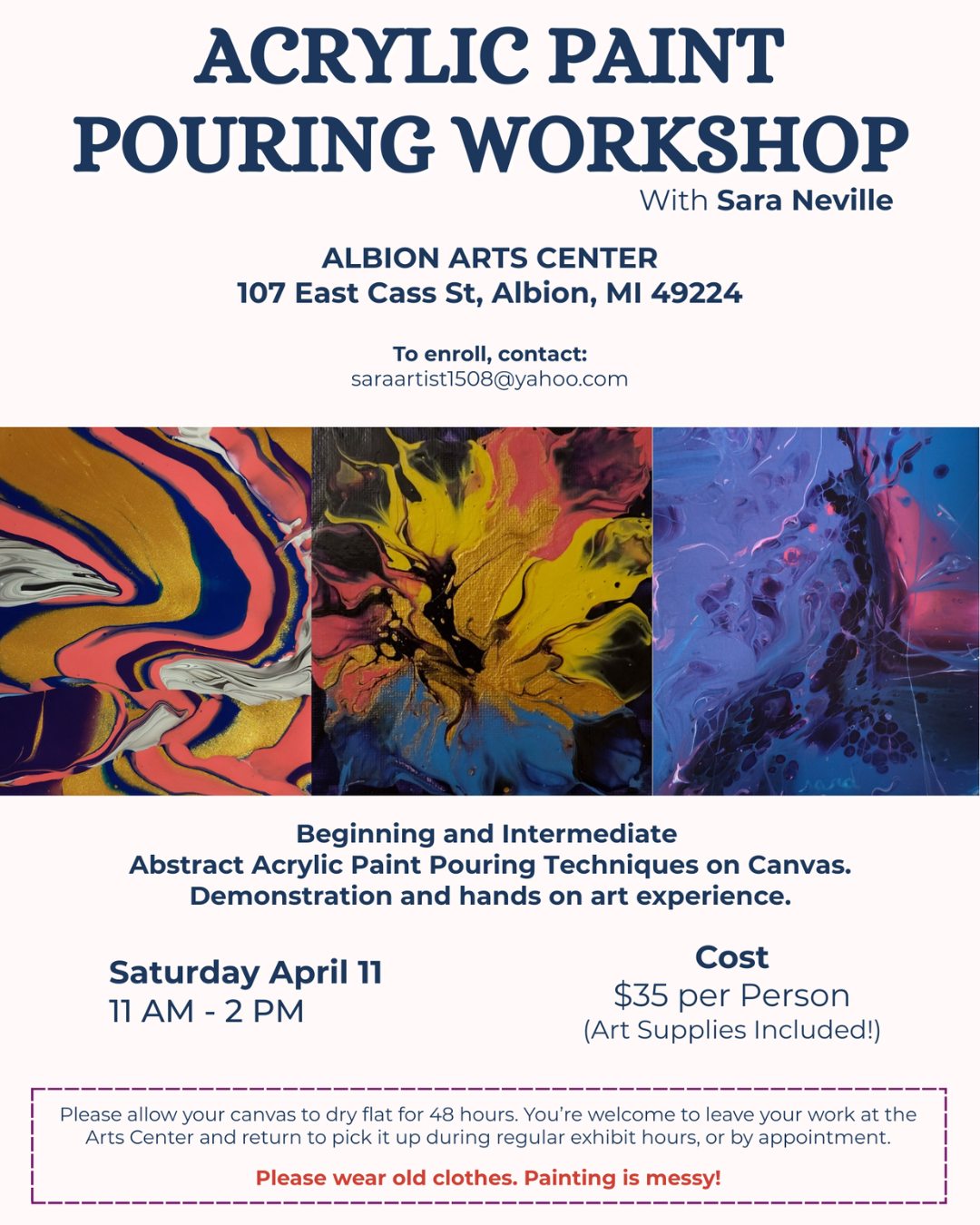 Create your own piece of art work with Sara Neville. Learn beginner and intermediate abstract acrylic paint pouring techniques on canvas. Demonstations and hands-on experience. $35 per person (includes art […]